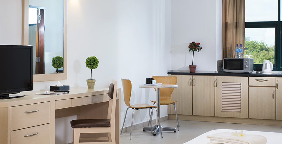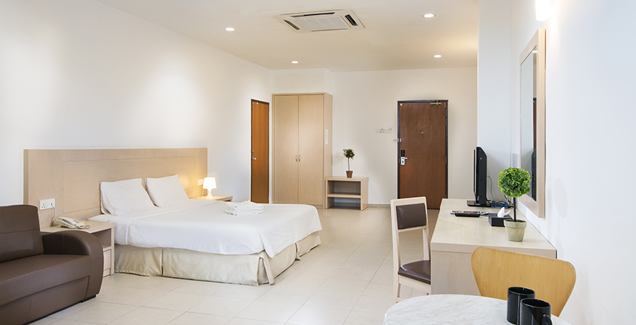 - Unit suite OYO NIAS yang luas dirancang dengan perabotan King Bed atau 2 x Full Size Bed (4 kaki)